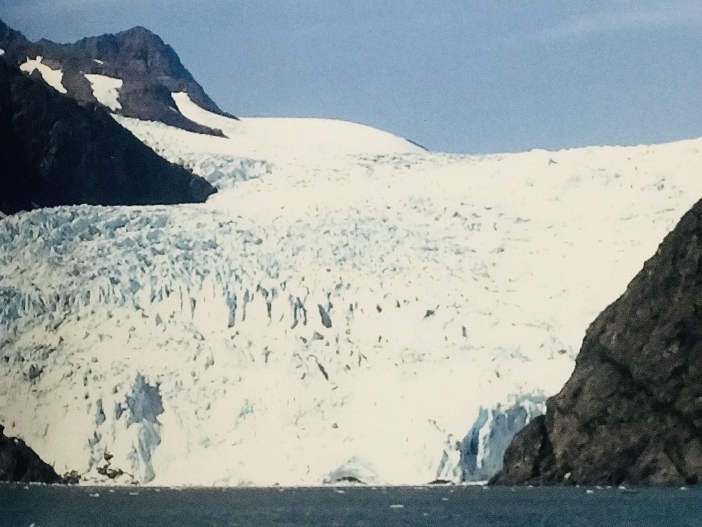 What struck me most, are the series of photographs of the Exit Glacier taken over the years with dates mentioning how the glacier has retreated due to ‘Global Warmimg’. The glacier moved away by almost 50 meters from it’s original point during the last 20 years due to gradual melting of it’s solid ice which is a grave danger to ecology system of Alaska. The winding path through the woods reverberating with sounds of flowing river water and chirping birds. On the way we saw some sign boards at intervals mentioning the ‘Glacier was here’ with month & year. Very soon we were rewarded with the majestic view of the glacier and looking below from a height we could see the new born river Resurrection gently trickling down from the source, the point of origin at the base of glacier. This was my first experience of viewing from close, the birth of a river.